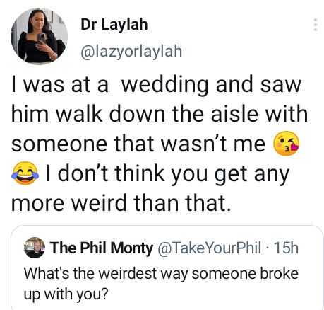 “I was at a wedding and saw him walk down the aisle with someone that wasn’t me. I don’t think you get any more weird than that.” she tweeted.