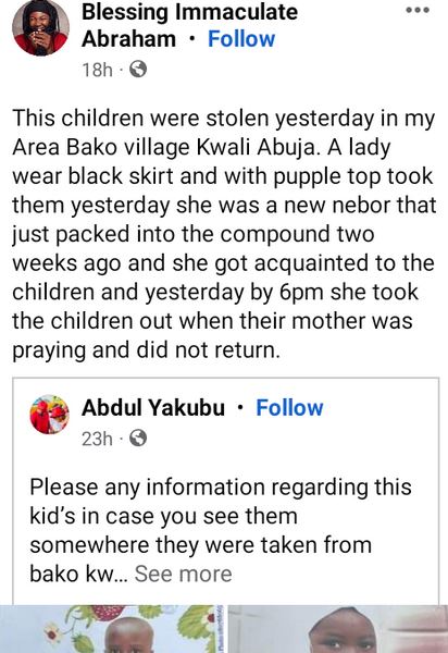 One Blessing Immaculate Abraham, in a Facebook post sighted by LIB, said one of the ladies was wearing a black skirt and purple top when she disappeared with the children around 6:pm on Wednesday.