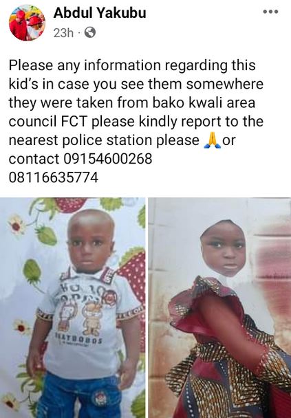 Meanwhile, one Abdul Yakubu, shared photos of the children, urging anyone with useful information on their whereabout to kindly contact the police or call the phone numbers: 09154600268, 08116635774.