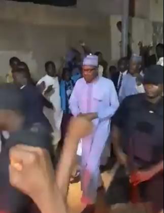 In the video, Buhari is being led by his security entourage to his car as the crowd of residents chant praises on him.