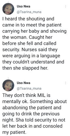 "Nurses said they were arguing in a language they couldn't understand and then she slapped her,” she tweeted.