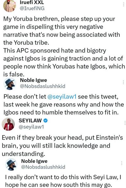 It all started when Noble reacted to a Tweet asking Yorubas to work towards dispelling the narrative being pushed around that they do not like Igbos.