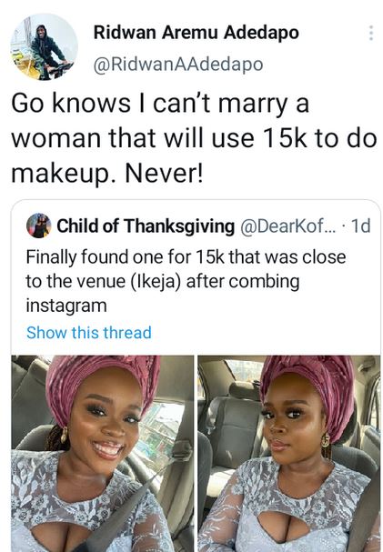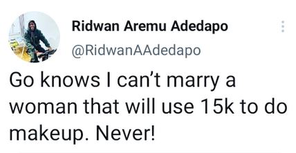 A Nigerian Twitter user, Ridwan Aremu Adedapo, has stated he cannot marry a woman that will pay the sum of N15k for her makeup.