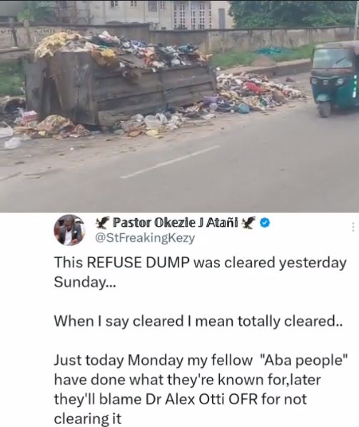 A Nigerian man has taken to Twitter to lament after residents in Aba, Abia state, filled up a refuse dump on a major road, hours after it cleared.