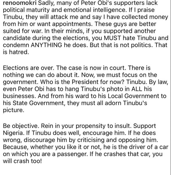 ‘’Sadly, many of Peter Obi's supporters lack political maturity and emotional intelligence. If I praise Tinubu, they will attack me and say I have collected money from him or want appointments. These guys are better suited for war. In their minds, if you supported another candidate during the elections, you MUST hate Tinubu and condemn ANYTHING he does. But that is not politics. That is hatred.