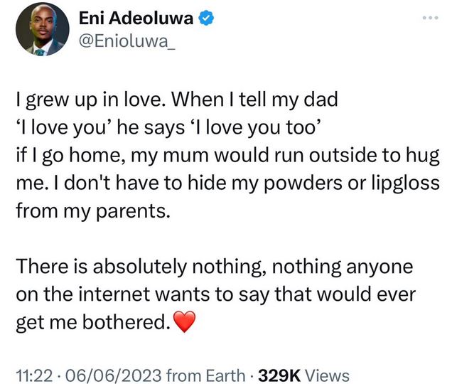 He made this known on Twitter while disclosing that he enjoys immense love from his parents and that for this reason, nothing negative being said about him online, bothers him.