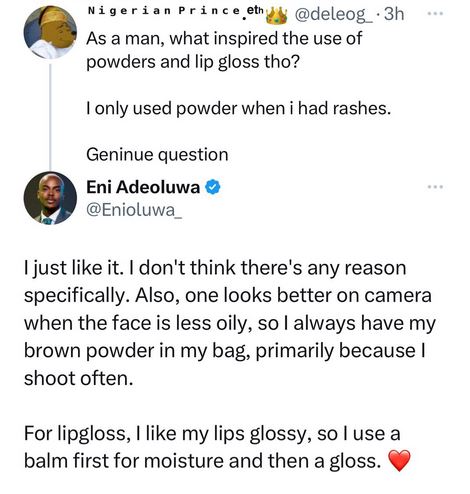 He also responded to a Twitter user who inquired why he uses lip gloss and other feminine products, stating that he uses brown powder to make his face less oily and when he wants to create content.