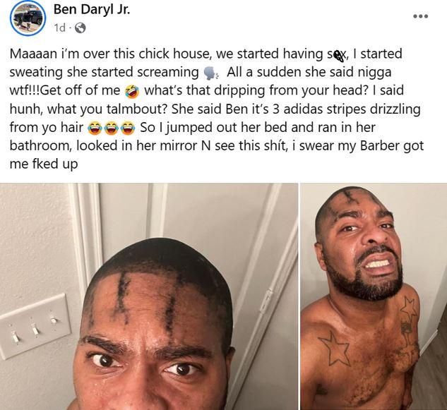 "Maaaan i’m over this chick house, we started having s3x, I started sweating she started screaming. All a sudden she said nigga wtf!!!Get off of me, what’s that dripping from your head? I said hunh, what you talmbout? She said Ben it’s 3 adidas stripes drizzling from yo hair. So I jumped out her bed and ran in her bathroom, looked in her mirror N see this shít, i swear my Barber got me fked up"