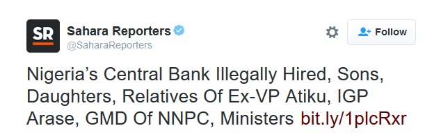 The list of beneficiaries of the CBN’s job largesse include a daughter of former Vice President, Abubakar Atiku, a son of Mamman Daura, a nephew of President Muhammadu Buhari and one of the closest members of the president’s inner circle, a son of the Minister of State for Petroleum Resources, Emmanuel Ibe Kachikwu, a daughter of former Speaker of the House of Representatives, Ghali Na’aba, also daughter of the Inspector General of Police, Solomon Arase, a son of the Minister of Internal Affairs, Abdurahman Danbazzau and at least 86 others.