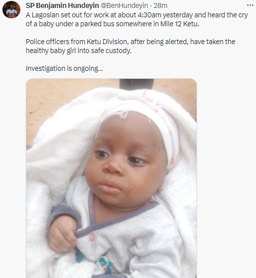 The resident heard the cry of the baby somewhere in Mile 12 Ketu and immediately alerted the police who came in and picked up the baby.
