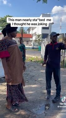 A video has captured the moment a TikTok skitmaker was almost stabbed by a security agent for wearing a female outfit during his a shoot.
