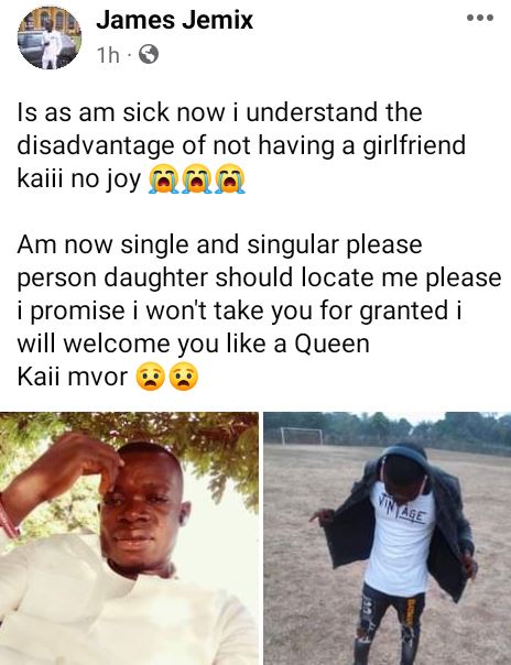 “Is as am sick now I understand the disadvantage of not having a girlfriend kaiii no joy. Am now single and singular please person daughter should locate me please, I promise i won't take you for granted I will welcome you like a Queen. Kaii mvor," he said in a Facebook post on Sunday, June 18.