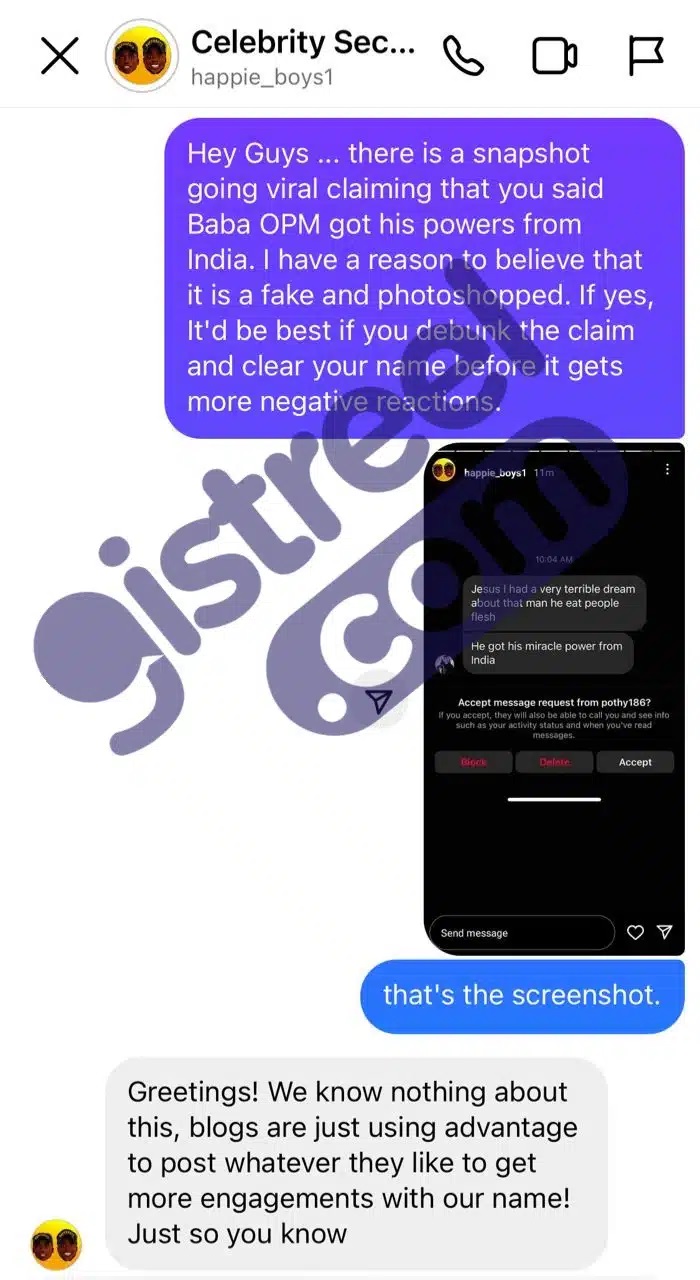 Popular security guards, Happie Boys have broken their silence after a screenshot allegedly from them claimed that Port Harcourt-based pastor, Apostle Chibuzor Gift Chinyere got his spiritual power from India.