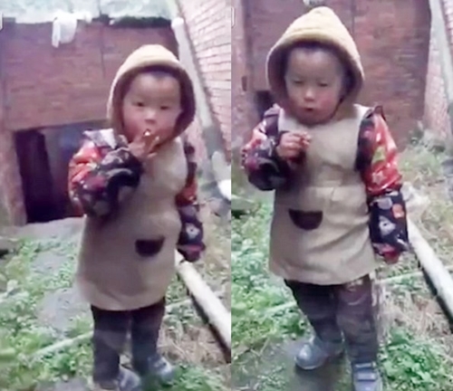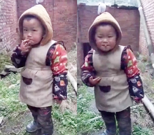 Obediently the child sticks the cigarette back into his mouth, even holding on to it with his lips, hands-free, just as a seasoned smoker would. The boy has even perfected the stance of an expert smoker, complete with the hand movements and tapping leg.