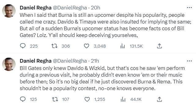 Following Gates comments on the Afrobeats superstars, Regha chided individuals who criticised Davido, Timaya and him for calling Burna an upcomer in the Nigerian music scene.