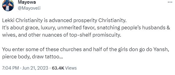 In a post shared on his handle, the man opined that Christianity in Lekki is about ‘’Luxury living, unmerited favour, snatching people’s husbands and other nuances.''