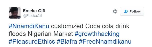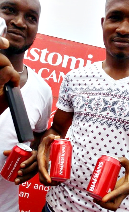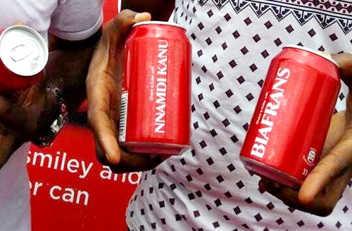 Supporters of the ongoing pro-Biafran separatist movement in the south-east, have claimed that soft drink company, Coca-Cola is supporting their cause after pictures purportedly showing some customized Coca-Cola cans with the words "Nnamdi Kanu" and "Biafrans" emerged on social media.
