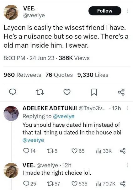 In response, a Twitter user opined that Vee should have chosen to date Laycon instead of Neo Akpofure.