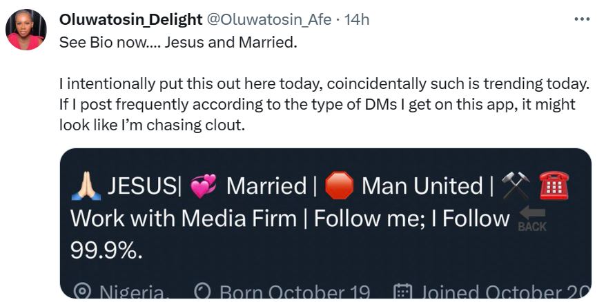 A Nigerian female Twitter user identified as Oluwatosin has taken to the microblogging platform to share a screenshot of the message she received from a follower who has "Jesus and Married" boldly written on his Twitter bio.