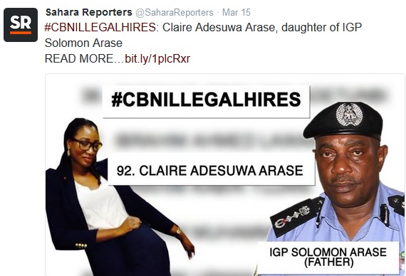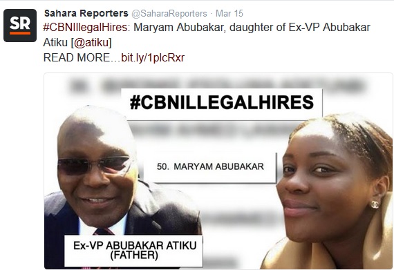list of beneficiaries of the CBN’s job largesse include a daughter of former Vice President, Abubakar Atiku, a son of Mamman Daura, a nephew of President Muhammadu Buhari and one of the closest members of the president’s inner circle, a son of the Minister of State for Petroleum Resources, Emmanuel Ibe Kachikwu, a daughter of former Speaker of the House of Representatives, Ghali Na’aba, also daughter of the Inspector General of Police, Solomon Arase, a son of the Minister of Internal Affairs, Abdurahman Danbazzau and at least 86 others.