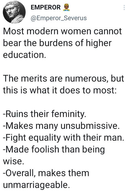 “Most modern women cannot bear the burdens of higher education. The merits are numerous, but this is what it does to most: -Ruins their feminity. Makes many unsubmissive. Fight equality with their man. Made foolish than being wise. Overall, makes them unmarriageable.” the Tweep wrote.