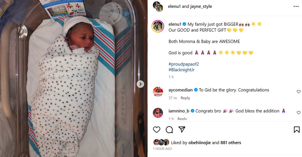 Popular Nigerian comedian, Elenu and his wife, Jane have has welcomed their second child.