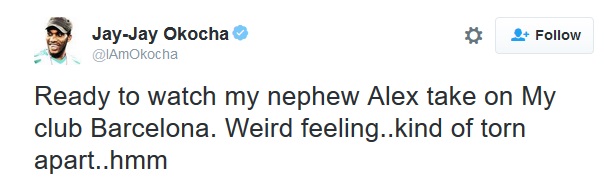 Self acclaimed football magician and former Super Eagles maestro, Jay Jay Okocha, has expressed his delight at his nephew Alex Iwobi's display, in Arsenal's 3-1 loss to Barcelona during a Champions league match on Wednesday.