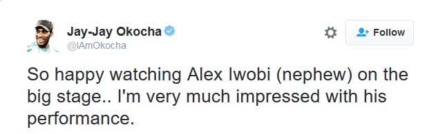 In a tweet at the end of the game, Okocha said: "So happy watching Alex Iwobi (nephew) on the big stage.. I’m very much impressed with his performance."