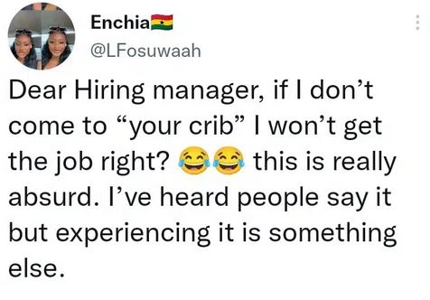 “Dear Hiring manager, if I don’t come to “your crib” I won’t get the job right? 😂😂 this is really absurd. I’ve heard people say it but experiencing it is something else”, she wrote.