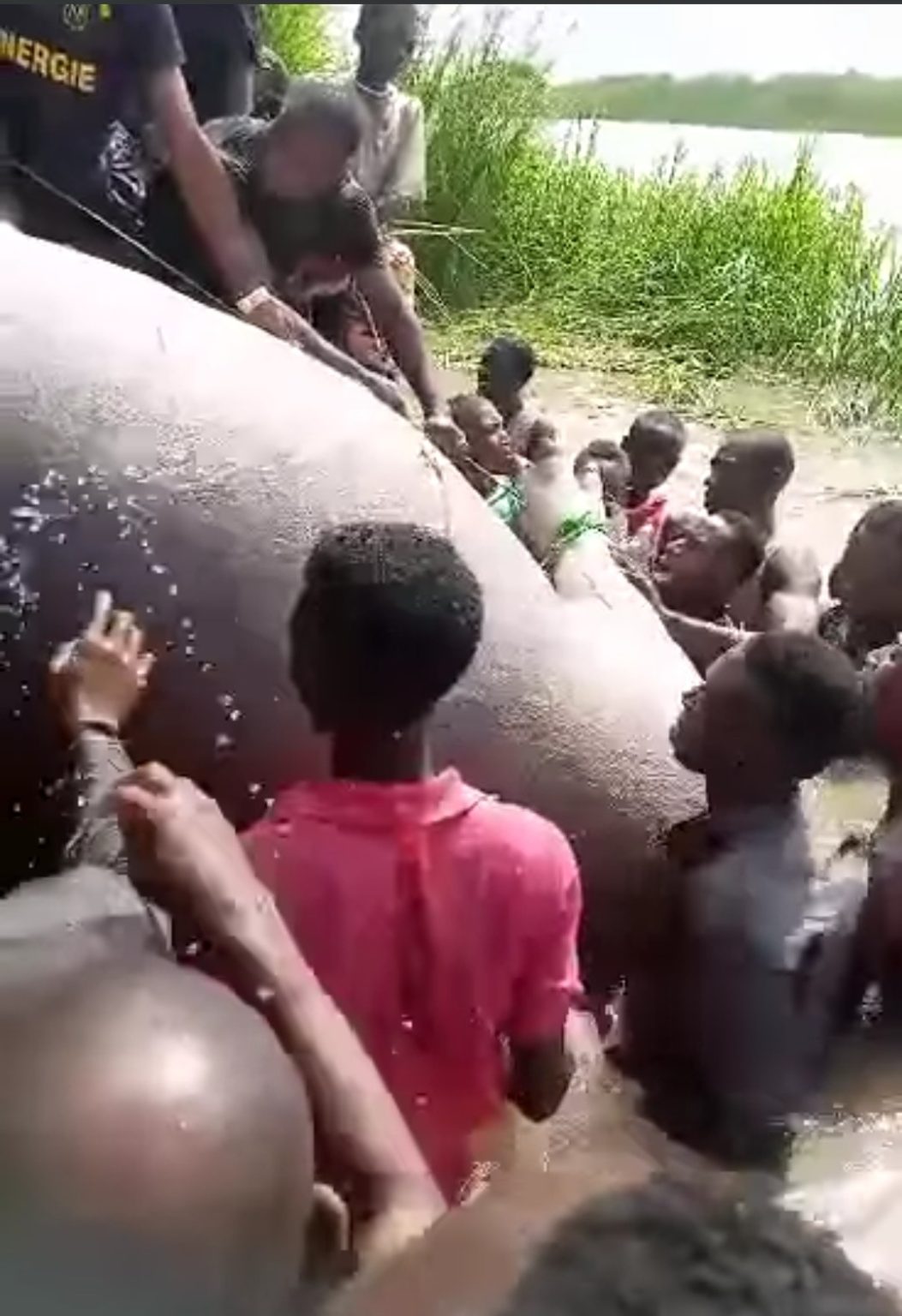 Sharing a video of the youths thrusting the lifeless beast, which looks like a hippopotamus, from the water, Ekani said it has been terrorising the waterways between Adeka and Ebete communities.