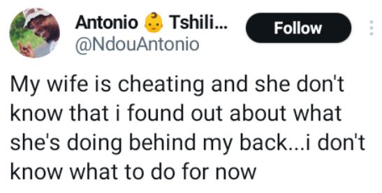 “My wife is cheating and she don't know that I found out about what she's doing behind my back. I don't know what to do for now,” he tweeted.