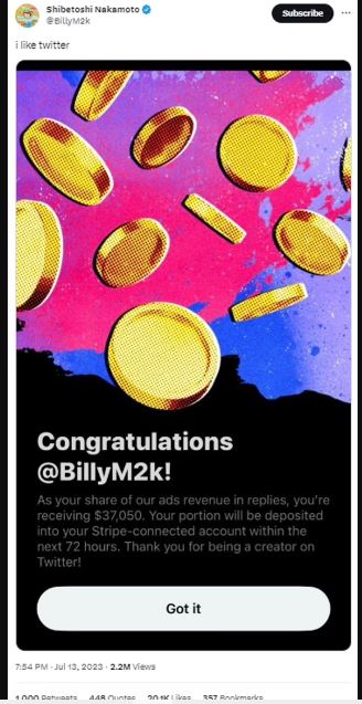 This scheme is only available to notable Twitter Blue subscribers, as creators will need to prove they received at least five million impressions on posts in the last three months.