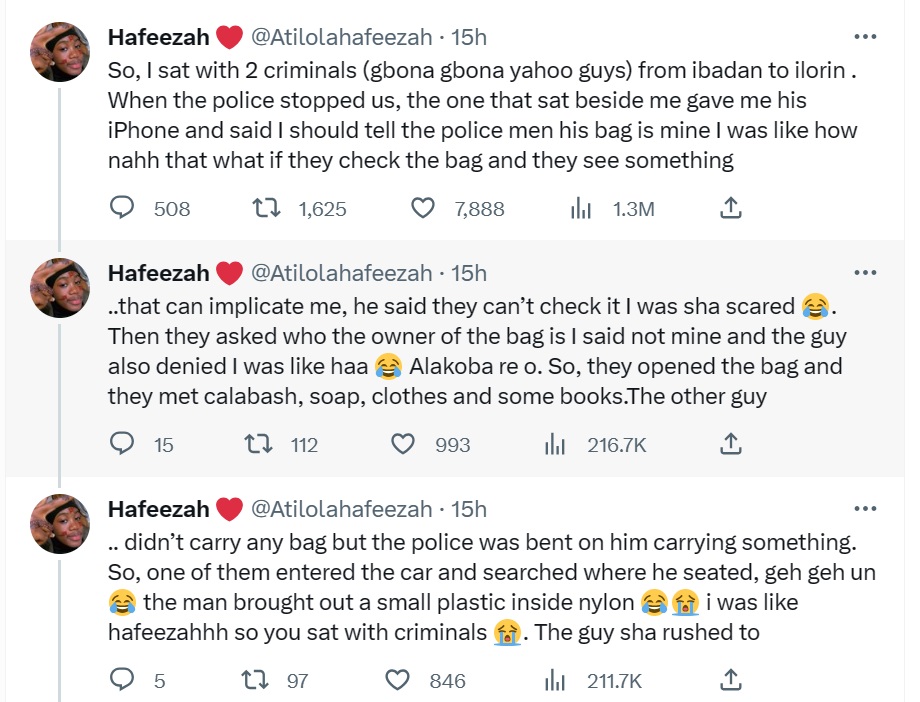 "So, I sat with 2 criminals (gbona gbona yahoo guys) from ibadan to ilorin . When the police stopped us, the one that sat beside me gave me his iPhone and said I should tell the police men his bag is mine I was like how nahh that what if they check the bag and they see something that can implicate me, he said they can’t check it I was sha scared.