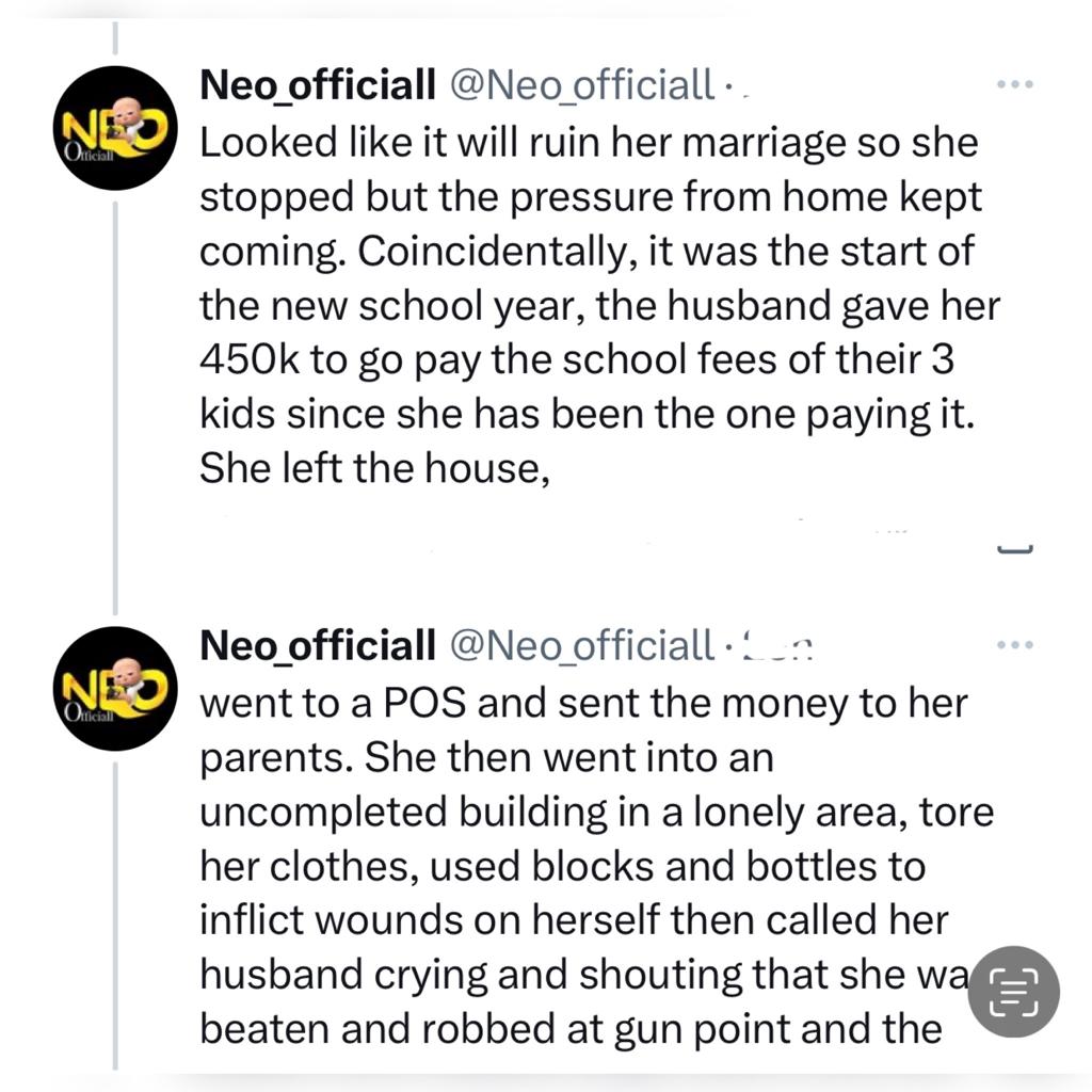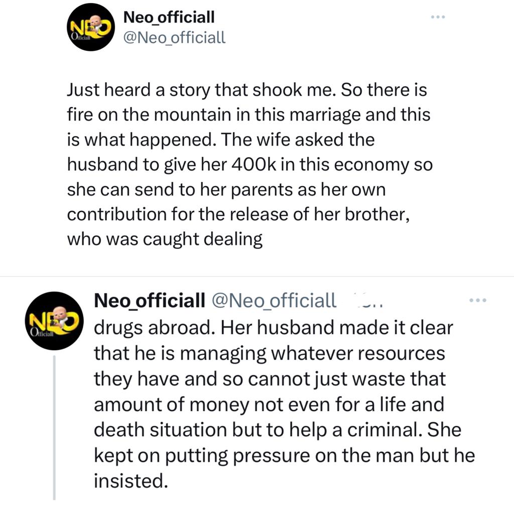 The man with the handle @Neo_officiall, made the allegation while sharing the story of a married woman who diverted the N450,000 her husband gave her to pay the school fees of their children and used the money to pay for the release of her husband arrested for drug trafficking.