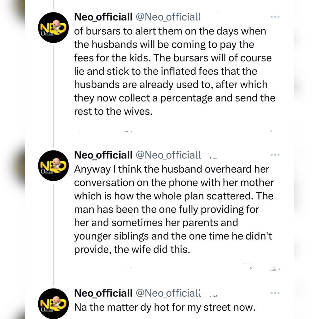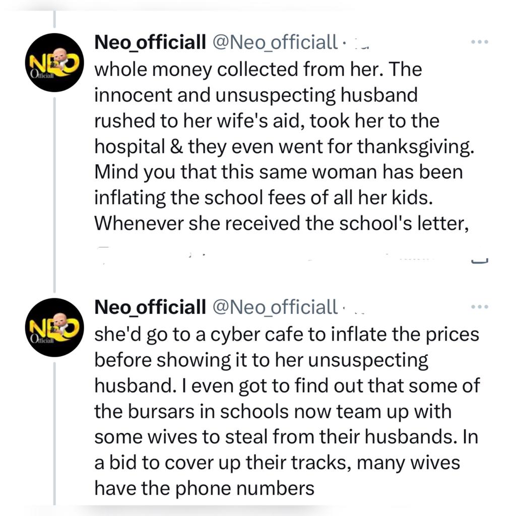 The man alleged that some wives have formed the habit of conniving with the bursars of their children's schools to inflate school fees just so they can defraud their husbands.