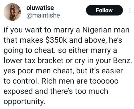 “If you want to marry a Nigerian man that makes $350k and above, he’s going to cheat. so either marry a lower tax bracket or cry in your Benz. yes poor men cheat, but it’s easier to control. Rich men are toooooo exposed and there’s too much opportunity," she tweeted on Friday, July 21.