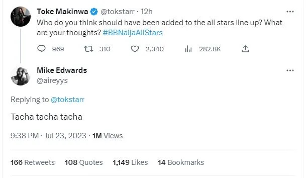 It all started when Toke Makinwa tweeted; “Who do you think should have been added to the all-stars line up? What are your thoughts? #BBNaijaAllStars.”