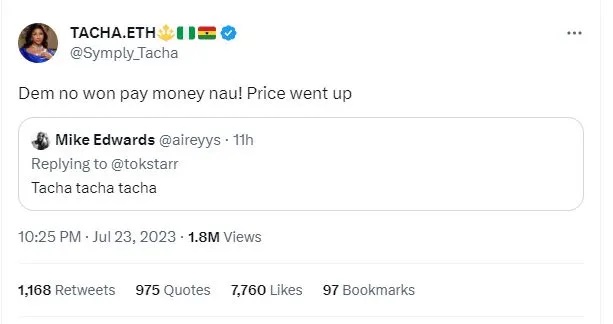 Tacha while responding to her colleague Mike Edwards on why she is not on the show, said that she's not satisfied with the price she was offered in order for her to grace the show.