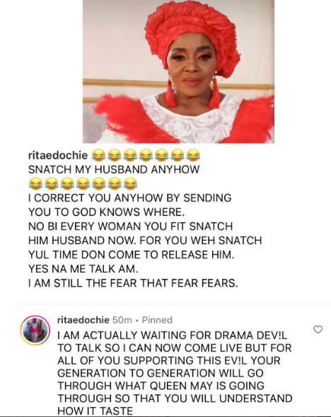 Veteran actress, Rita Edochie has called out the 'drama devil' that snatched Yul Edochie from his wife, May Edochie.