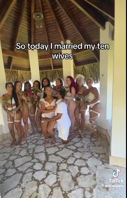 In the video, the African American groom is seen radiating with joy as he poses with his ten newly-wedded wives, all dressed in resplendent wedding attire.