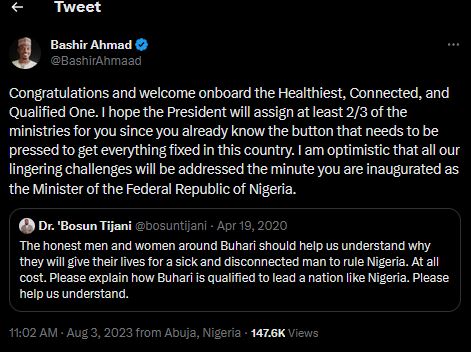 Bashir Ahmad, an aide to the immediate past president, Muhammadu Buhari has taken a swipe at Bosun Tijani, one of the ministerial nominees of President Bola Tinubu.