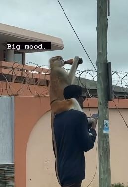 A video of a monkey on a stroll with its owner has gone viral. The monkey was spotted having a drink while hanging on the neck of its owner who was taking a stroll.