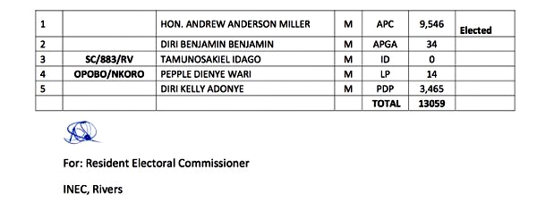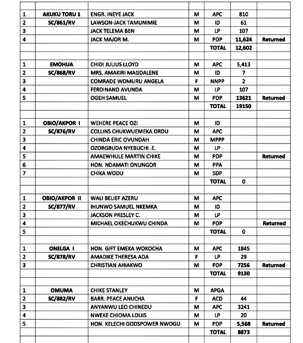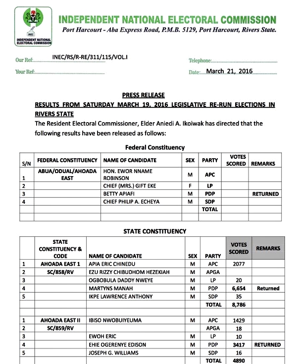 The Independent National Electoral Commission (INEC) has released some of the results in Saturday's legislative re-run election in Rivers State.