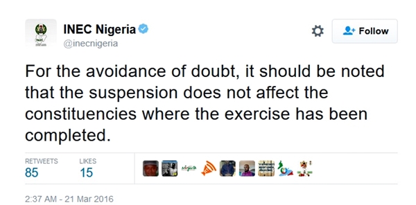 Clarifying it’s latest order, INEC said, "The suspension does not affect constituencies where the exercise has been completed and the results declared by the returning officers."