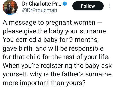 “A message to pregnant women — please give the baby your surname. You carried a baby for 9 months, gave birth, and will be responsible for that child for the rest of your life. When you’re registering the baby ask yourself: why is the father’s surname more important than yours?” she tweeted on Wednesday, August 9.