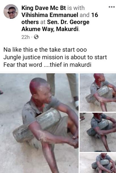 “Na like this e the take start ooo. Jungle justice mission is about to start. Fear that word ....thief in Makurdi,” he said.