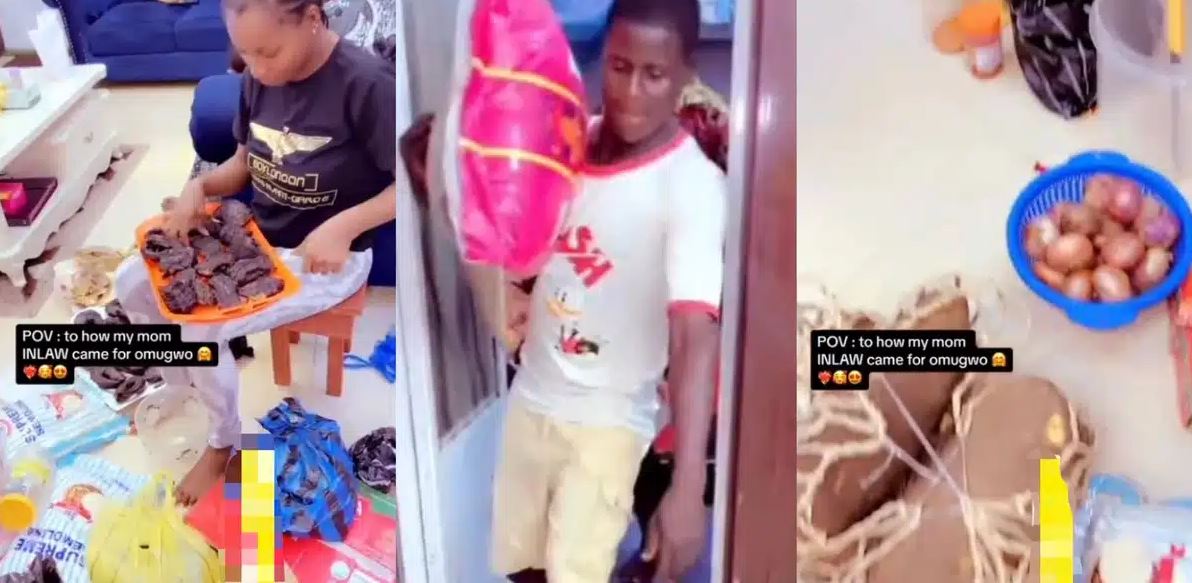 A video has shown the moment a woman arrived her daughter-in-law's home with different foodstuffs such as a bag of rice, fish, among others for Omugwo.