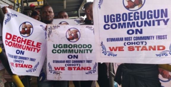 The protesters displayed placards bearing inscriptions such as "Ugborodo Community on Otumara Host Community Trust (OHCT) We Stand," "Deghele Community on Otumara Host Community Trust (OHCT) We Stand," and "Ughboegugun Community on Otumara Host Community Trust (OHCT) We Stand," and “We want the Petroleum Industry Act to be given to us,” among others.