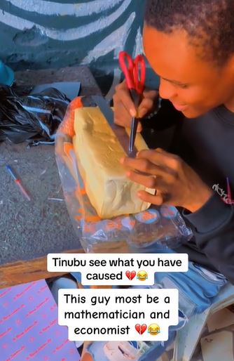 Social media users are reacting to a viral video of a Nigerian man dividing a large bread using a ruler, pen, and scissors.