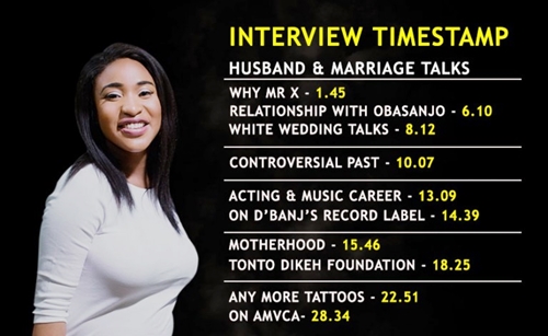 Golden Icons, the talented actress and singer, discussed the new chapter in her life and career. The birth of her child, white wedding plans, husband’s relationship with former Nigerian President, Olusegun Obasanjo, her controversial past, tattoos, and leaving her record label with music superstar, D'Banj.